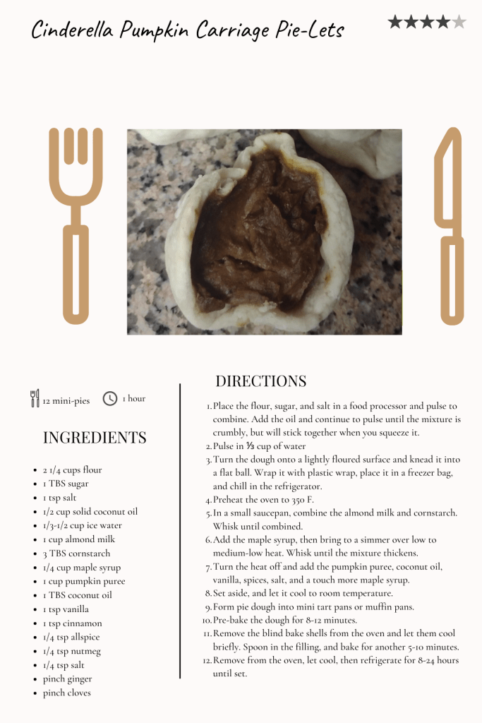 I tried to think of something iconic from Cinderella that would also be a good flavor. While I could challenge myself to make a glass slipper out of sugar, not only would that probably be impossible for a home baker like myself, it wouldn’t have much flavor. So what else? The pumpkin carriage! And it just so happens to be pretty timely for fall– mini pumpkin pies! I also ordered a silicone mold with pumpkin and leaf shapes, but these can also be made in a muffin pan.