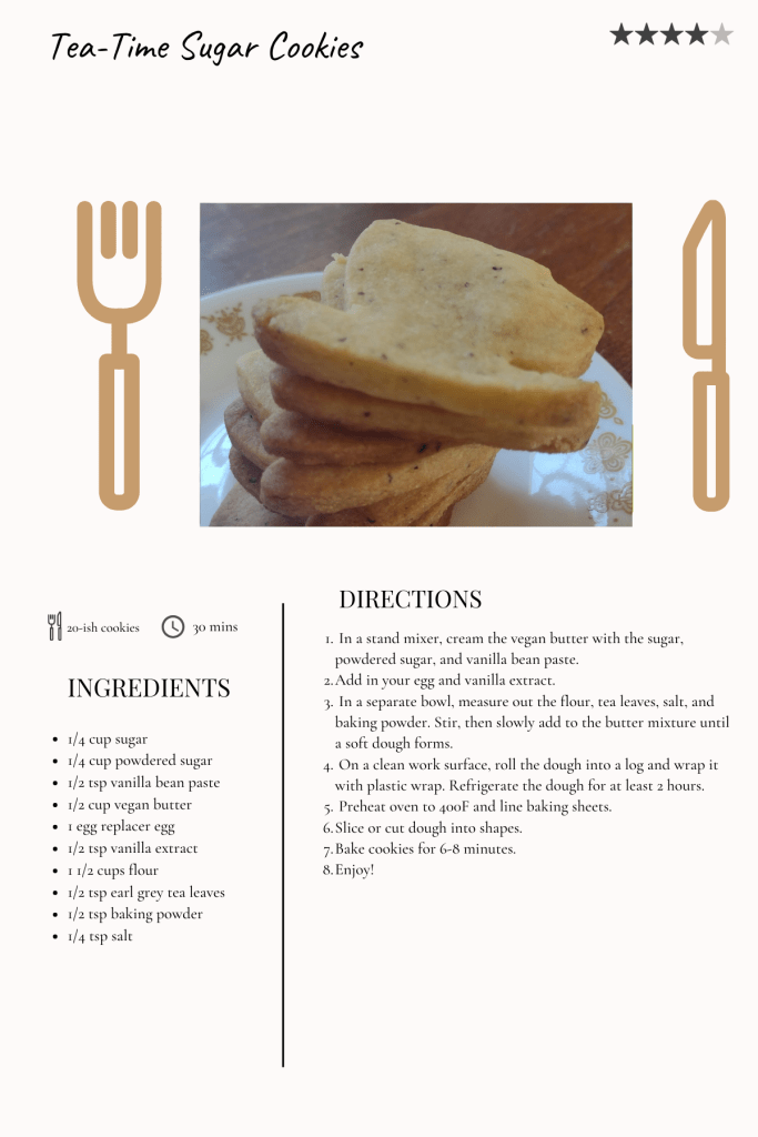 Alice in Wonderland is probably my favorite movie from the Silver Age. I wanted to think of something clever and whimsical for such a silly film. The scene with the Mad Hatter and the March Hare is the most memorable to me, and so I decided to bake something that connected to that scene, and Tea Time, in particular. I settled on an Earl Grey Sugar Cookie.