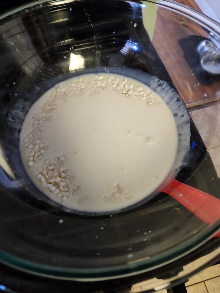 The day before you plan on doing most of the baking, create the ice cream base. In a saucepan, heat the white chocolate, soymilk, coconut cream, and agave syrup together in a double-boiler. Vegan white chocolate chips can be hard to find, but I used Enjoy Life White Chocolate Mini-Chips. King David’s also has a white chocolate, and Pascha’s is a last resort (they don’t melt very well). For whipping cream, Silk has a great one.