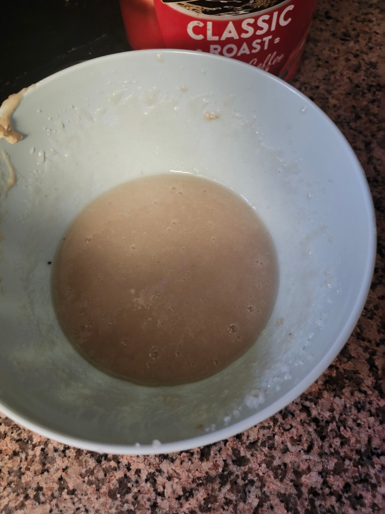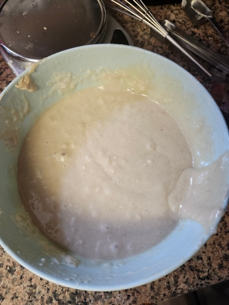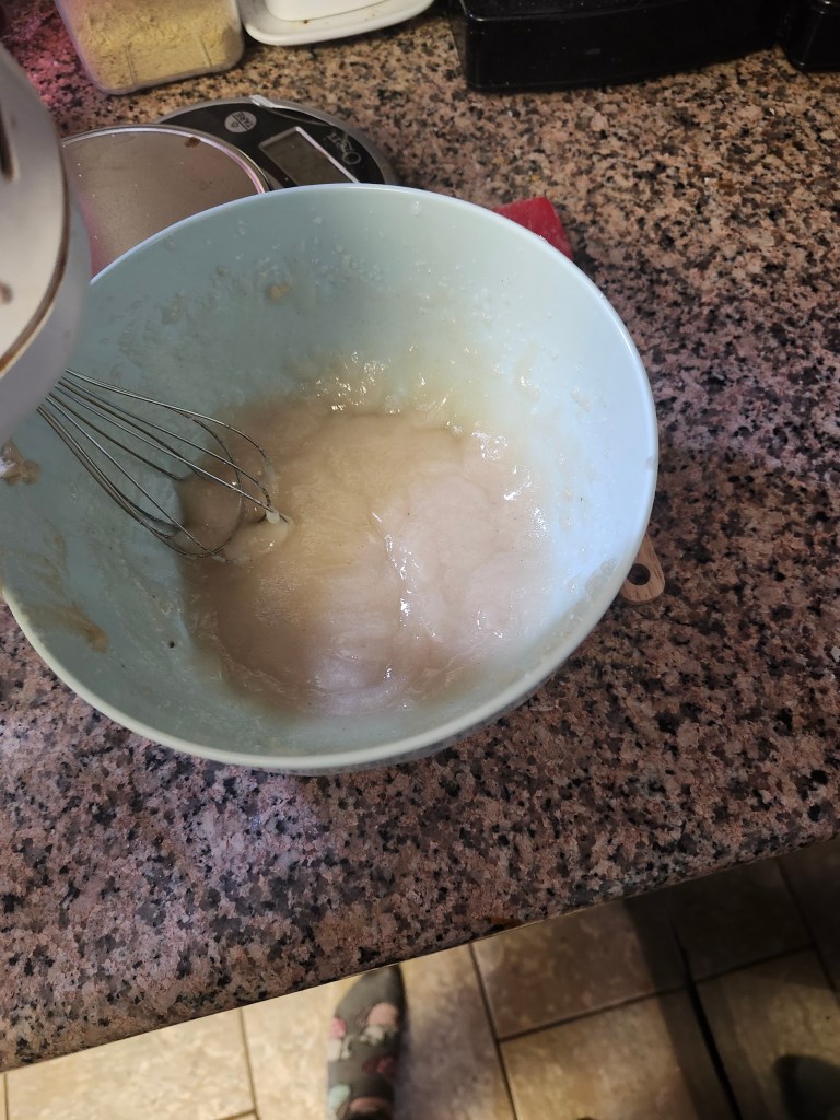 Moving on to the actual malva pudding, preheat your oven to 340F or 170C. Then, whip together the fake egg and the sugar until it is light and fluffy. Alternatively, you can use 50g aquafaba. Then, warm up the soymilk and vegan butter.