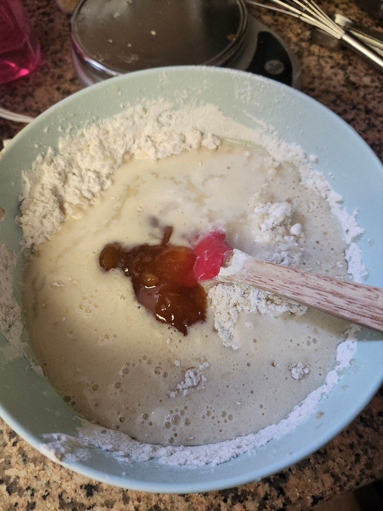 Gently add the flour, baking soda, and salt to the egg mixture. Fold it in, trying not to knock too much air out. Then, add the milk, butter, apricot jam, and vinegar and stir until just mixed.