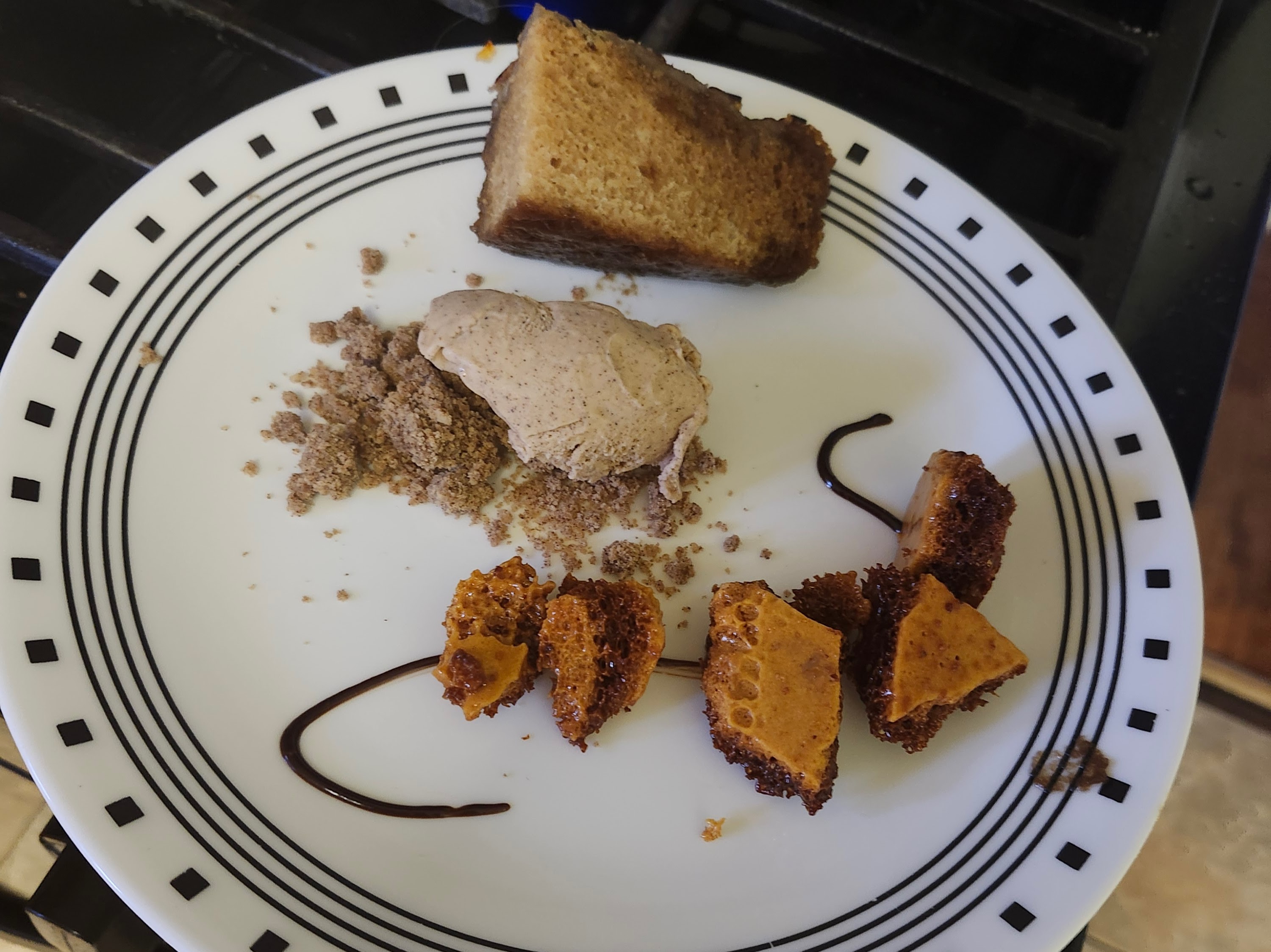 To serve, flip the malva pudding over so that the bananas are on top, then sprinkle it with sugar and torch it with a kitchen torch. Cut a slice and plate it. Add a scoop of pecan crumble to the plate and top it with the ice cream. Add a few pieces of honeycomb, and stylistically pipe the ganache onto the plate.