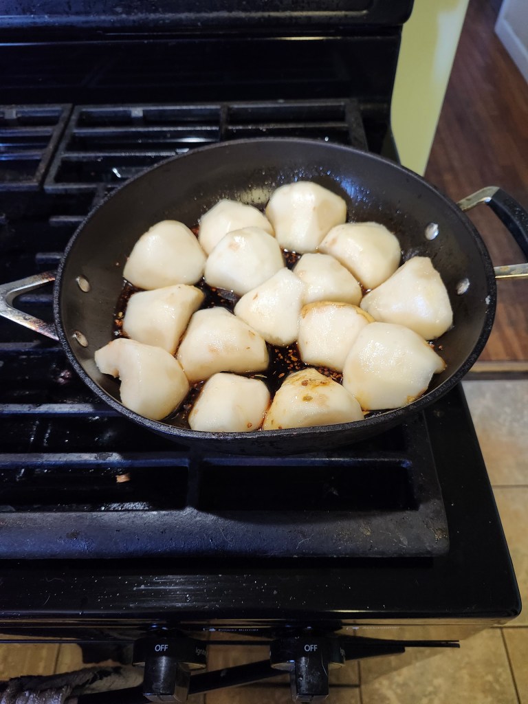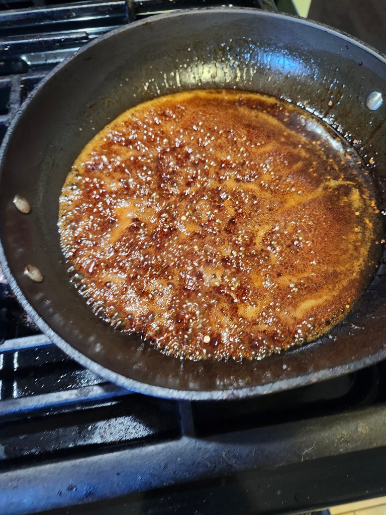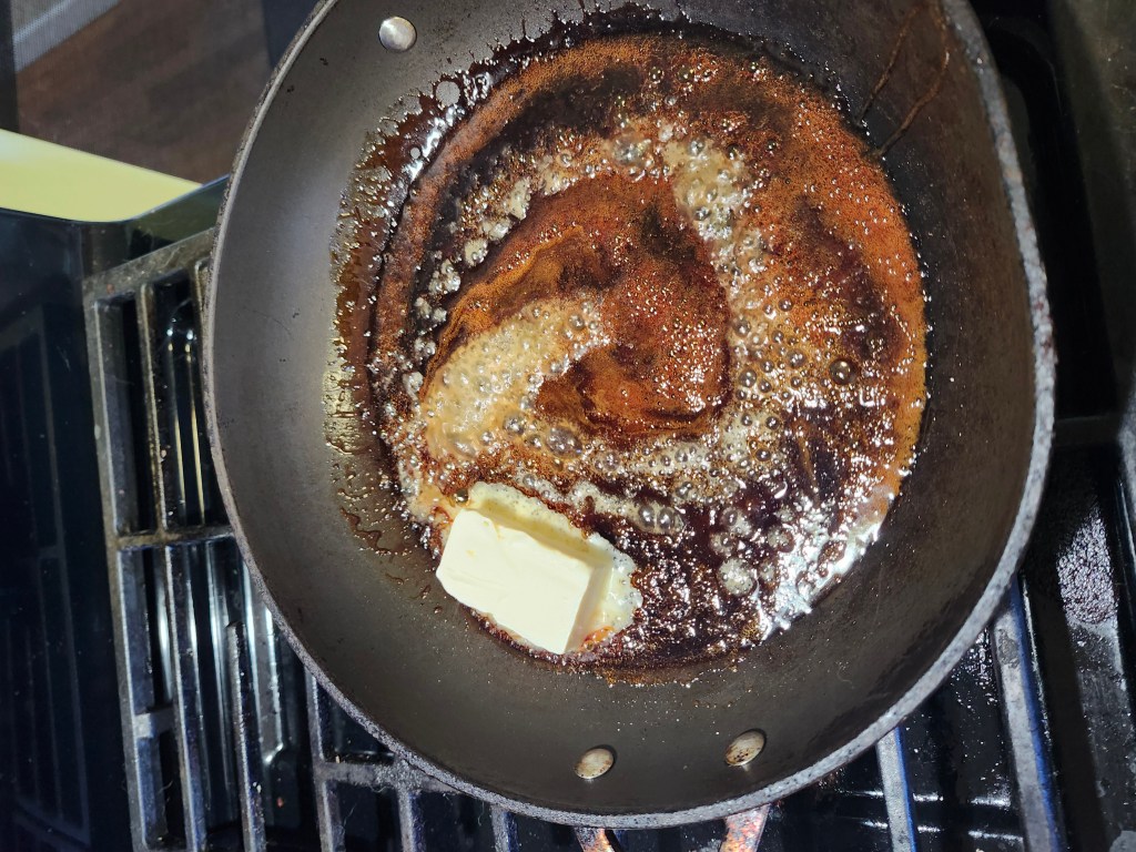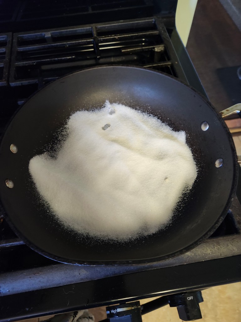 Sprinkle the sugar over the base of a frying pan, then place the pan over medium-high heat and cook without stirring for 2 minutes, or until the sugar begins to dissolve and turns light-golden. Then, add the butter and stir until it melts. Then, add your pear– peeled, cored, and sliced lengthwise. Make sure to coat them thoroughly in the caramel!