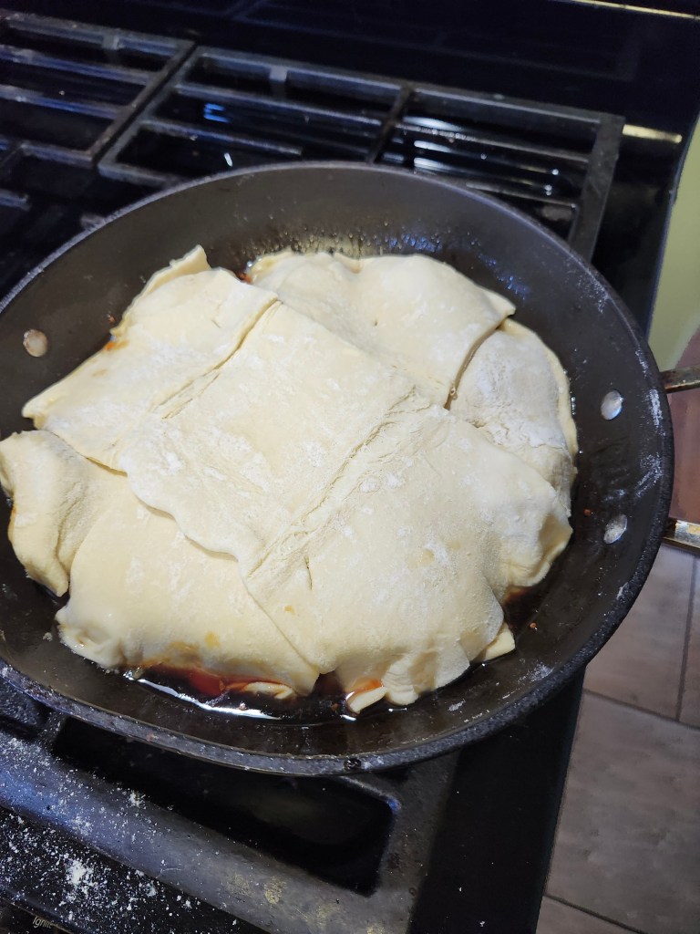 Start by just preheating the oven to 390F. Then, cut the sheets of puff pastry in half crossways to create two smaller rectangles. Lay one over the other to make a cross. Prick the sheets with a fork, then return them to the fridge to stay chilled.