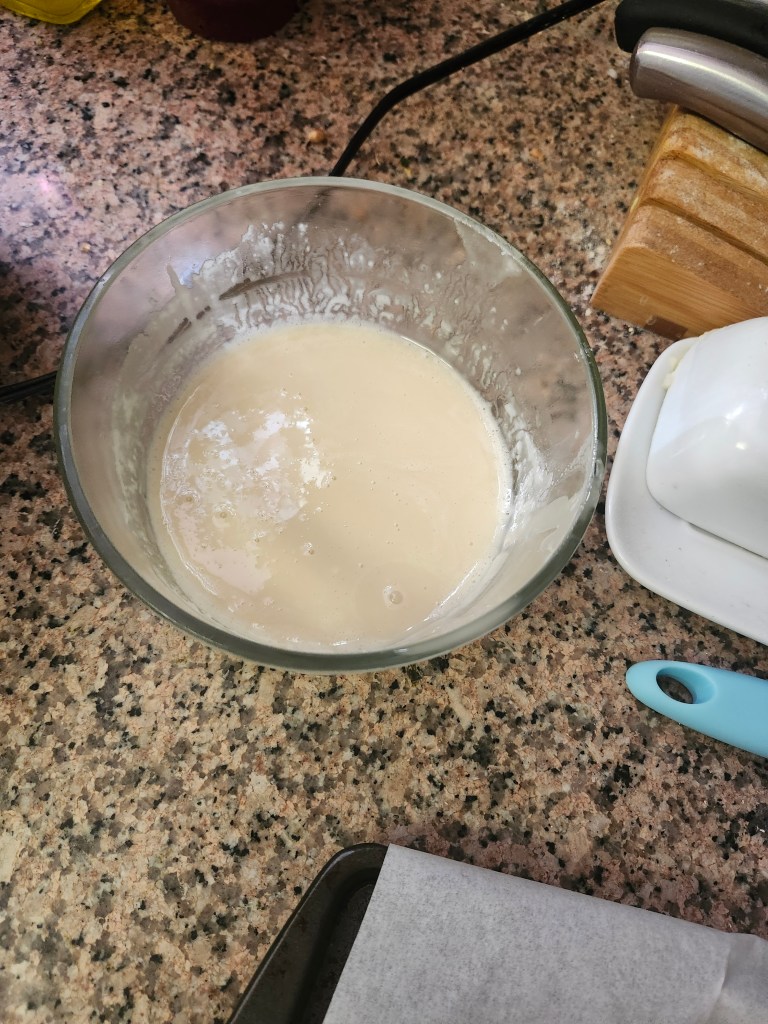 Start by blooming your yeast. Warm up the milk, (about 80 degrees F; you should be able to stick your finger in it and feel that it’s warm, but not so hot that it burns you or you have to take your hand out immediately) then mix it together with the yeast and 1 teaspoon of sugar. The yeast should froth up after about 10 minutes.