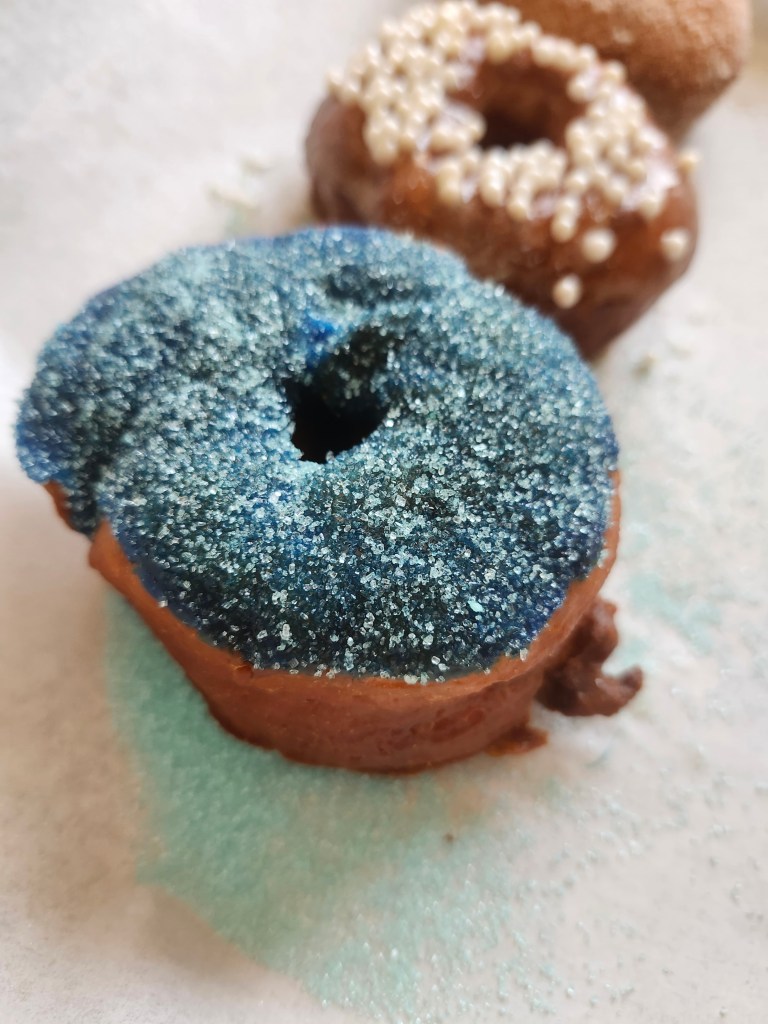 Also prepare the chocolate frosting. Melt the chocolate chips over a double-boiler, then stir in the butter and maple syrup. From there, decorate the donuts as you desire! I used various sprinkles, luster dust, food coloring, and cinnamon sugar.