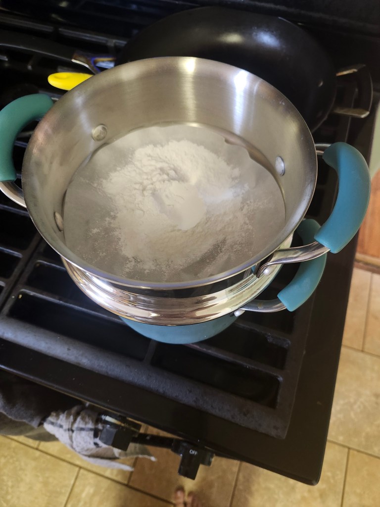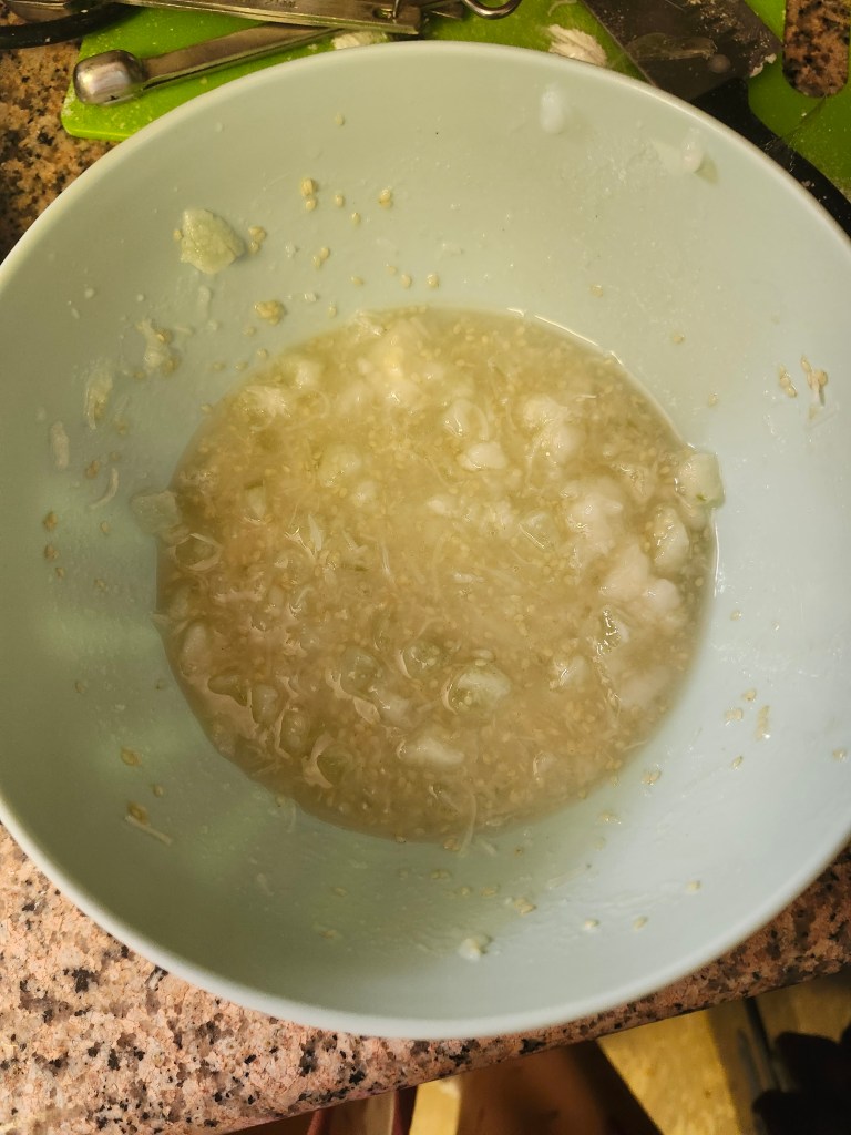 Before you can even really start mixing ingredients together, you have to cook your rice flour. It’s not really a flour substitute in the way that we (Westerners) use flour in baking. In this recipe, it’s an additional method of helping all the ingredients stick together. What I did was use a steamer. I put a 9in parchment round (that I usually put in the bottom of a cake pan) in the steamer basket, then filled the bottom pot with water and cooked my flour with steam for about an hour, until it was nice and sticky.
