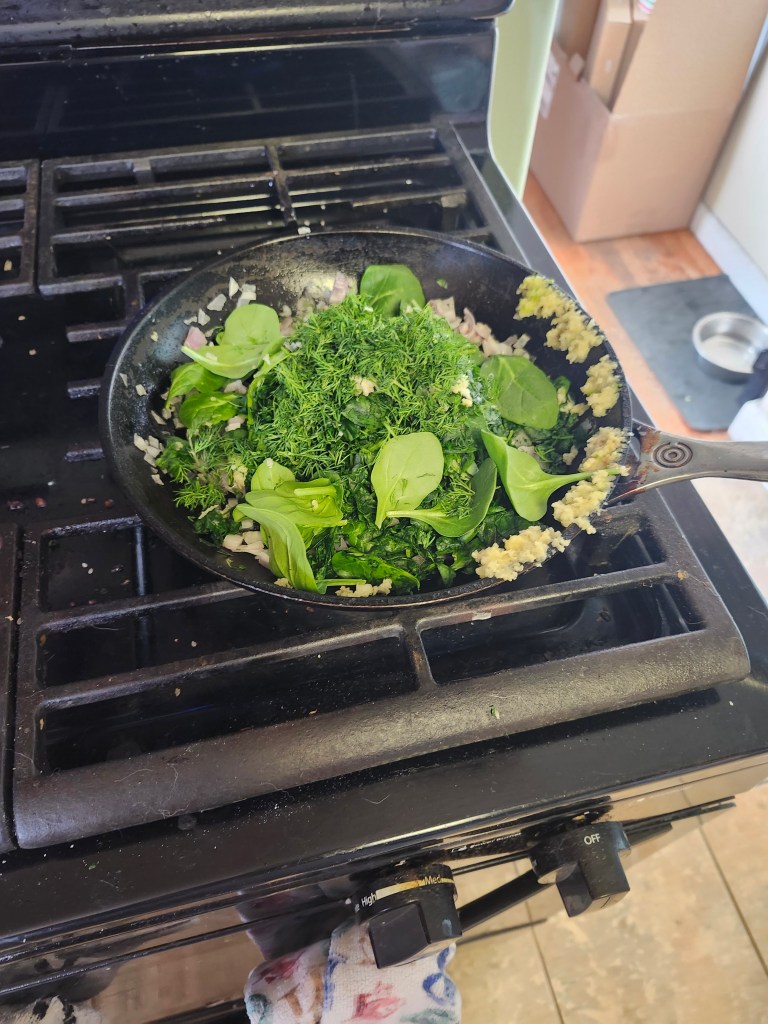First, preheat the oven to 450F and lightly grease a muffin tin. Then, we’re gonna start with the aromatics. Heat up a little bit of olive oil into a skillet, and cook up your shallot until it’s slightly transparent. Then, add the spinach, garlic, and dill. Cook it until the spinach is wilted and you can just smell the garlic.