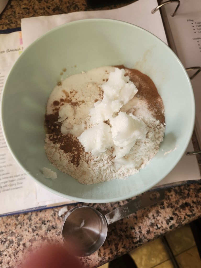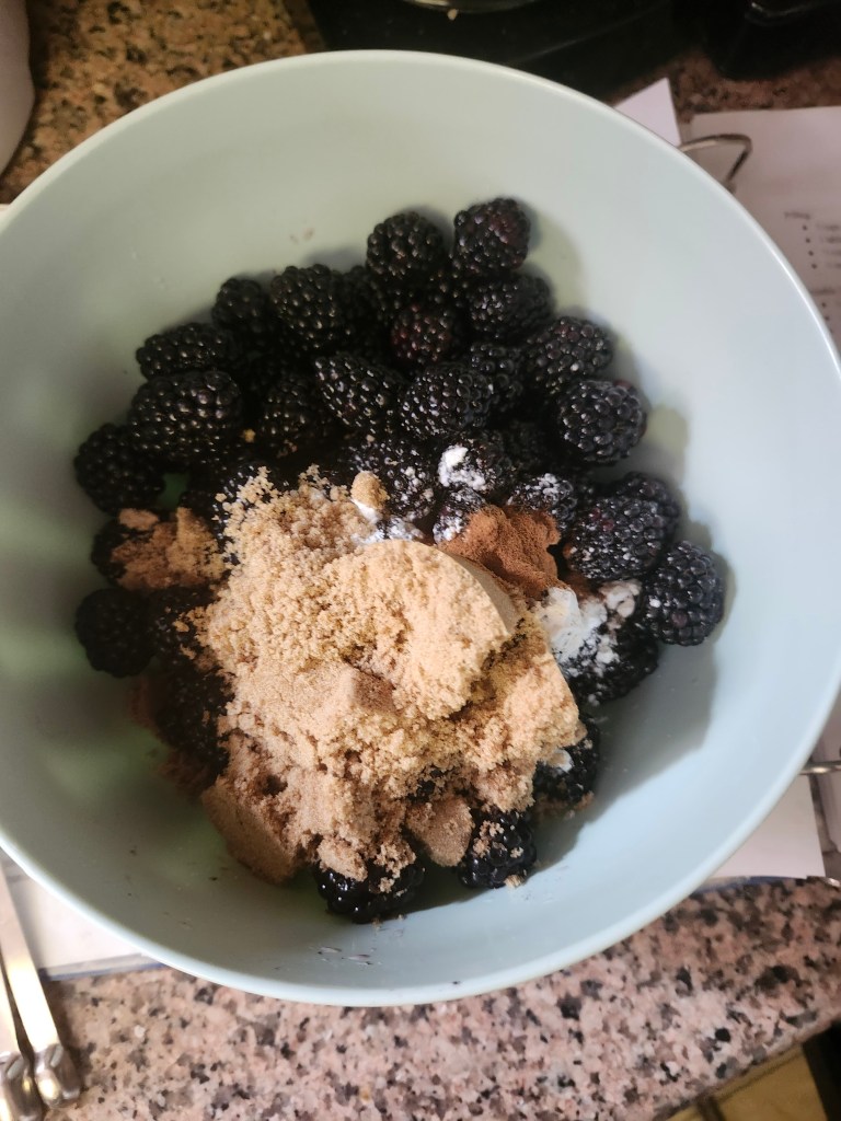 This is a pretty standard crisp. Preheat the oven to 375F and prep a 9×9 baking pan. Stir together all the filling ingredients (blackberries, cornstarch, brown sugar, 1/2 tsp cinnamon), then pour it into the baking dish.
