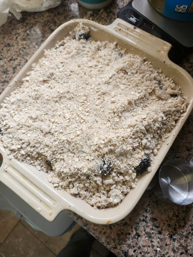 Then, in a separate bowl, mix the flour, oats, sugar, vanilla, and the other 1/2 tsp cinnamon. Once they’re all mixed, add the coconut oil, and rub it in gently until the mixture makes a breadcrumb-like texture. Sprinkle the crisp topping over the blackberry mixture.